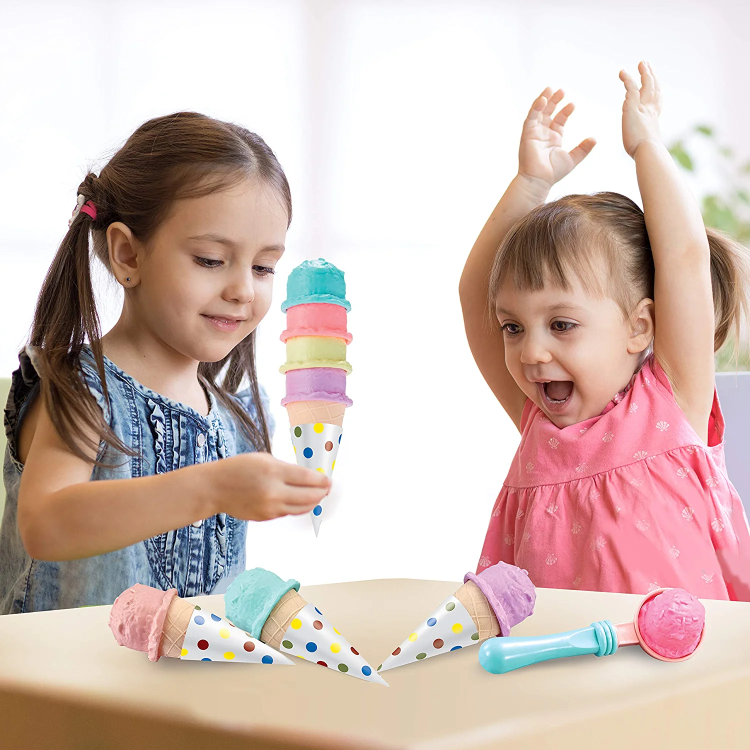 This colorful ice cream playset will lead to endless pretend play. The 17 piece toy ice cream set includes 8 scoops of ice cream, cones with paper holders, and an ice cream scooper.