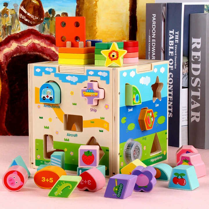 Its a Multifunctional wooden shape sorter with four column and various shapes to sort helping kids learn about a variety of shapes. It also improves hand eye coordination and fine motor skills.